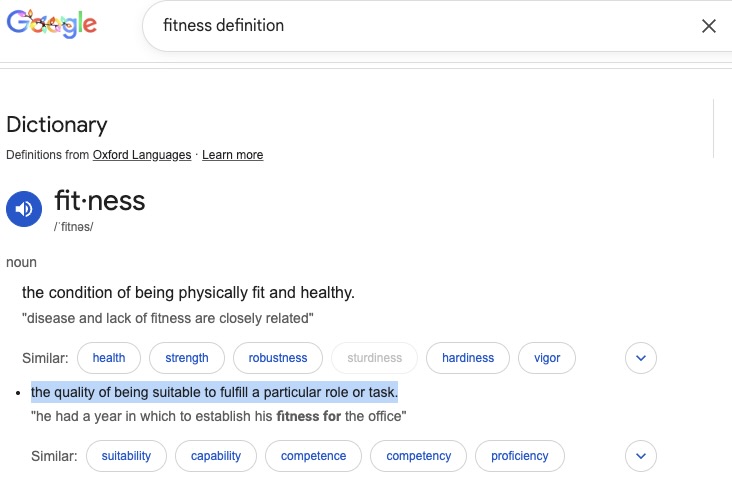 This broader definition is closer to the dictionary meaning: “the quality of being suitable to fulfill a particular role or task.” By that standard, an athlete’s fitness isn’t measured solely by VO₂max or squat max. Instead, it’s measured by whether their physiology, skills, tactical decision-making, and mental readiness can combine to meet the exact demands of their sport.